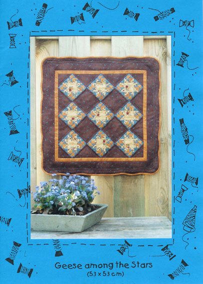 Een mini met een speciale golvende rand, waarin sterren en flying geese worden gecombineerd. De afmeting is 53 x 53 cm.