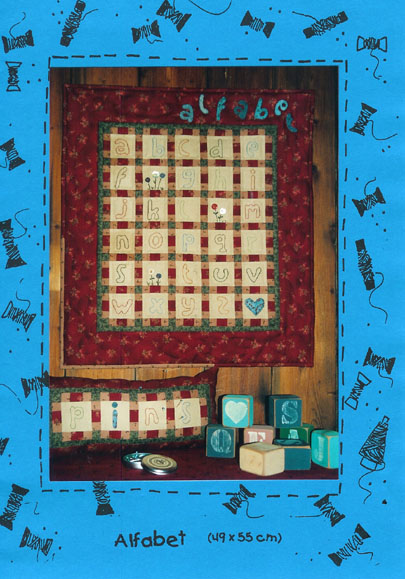 Een miniquiltje met een geborduurd alfabet. De afmeting is 49 x 55 cm.