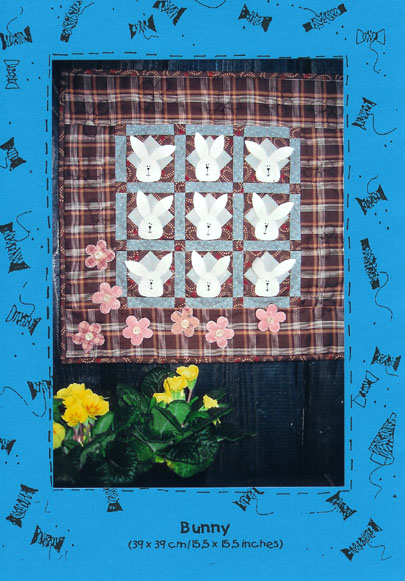Een quiltje met geappliceerde konijntjes. De afmeting is 39 x 39 cm.